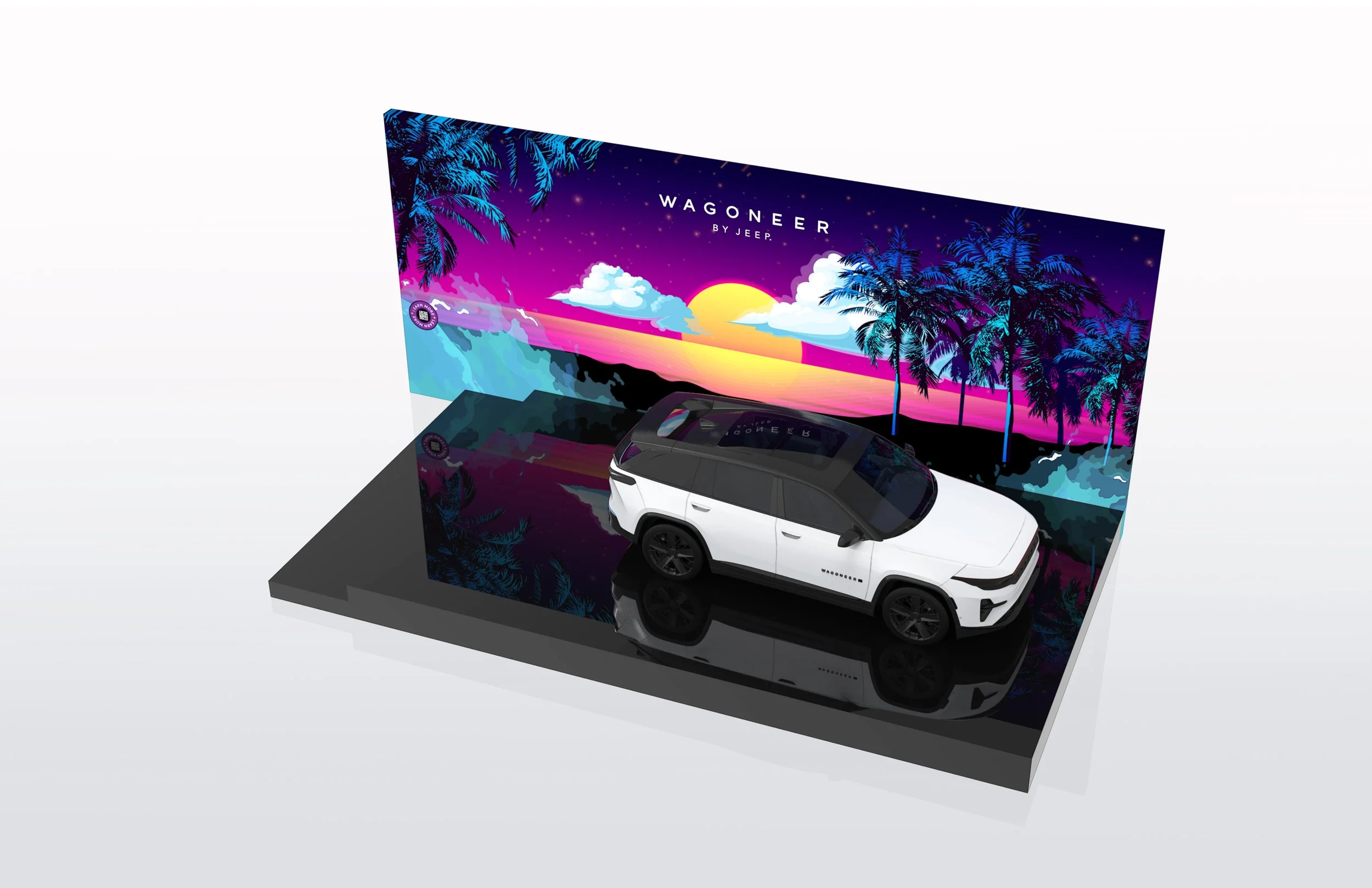 The Wagoneer project draws significant inspiration from bold design elements, vibrant colors, and pop-up art installations, all of which are integral to creating an immersive and picturesque experience for users. This approach aligns with the dynamic energy of the Wagoneer, using design as a way to evoke emotion and engagement. The use of color is particularly important in this project. Drawing from Miami’s vibrant art scene, where bold hues and striking contrasts dominate, the backdrop for the Wagoneer is designed to be visually captivating. The palette reflects the energy and vibrancy of the city, incorporating pops of color that not only highlight the vehicle’s design but also create a stunning visual experience that attracts attention. The pop-up design concept is also a key influence. Inspired by the temporary, yet impactful nature of pop-up installations seen in urban environments, the backdrop is designed to be both functional and visually arresting. This creates a sense of spontaneity and excitement, much like an art piece that suddenly appears in a cityscape, inviting people to explore and interact with it.