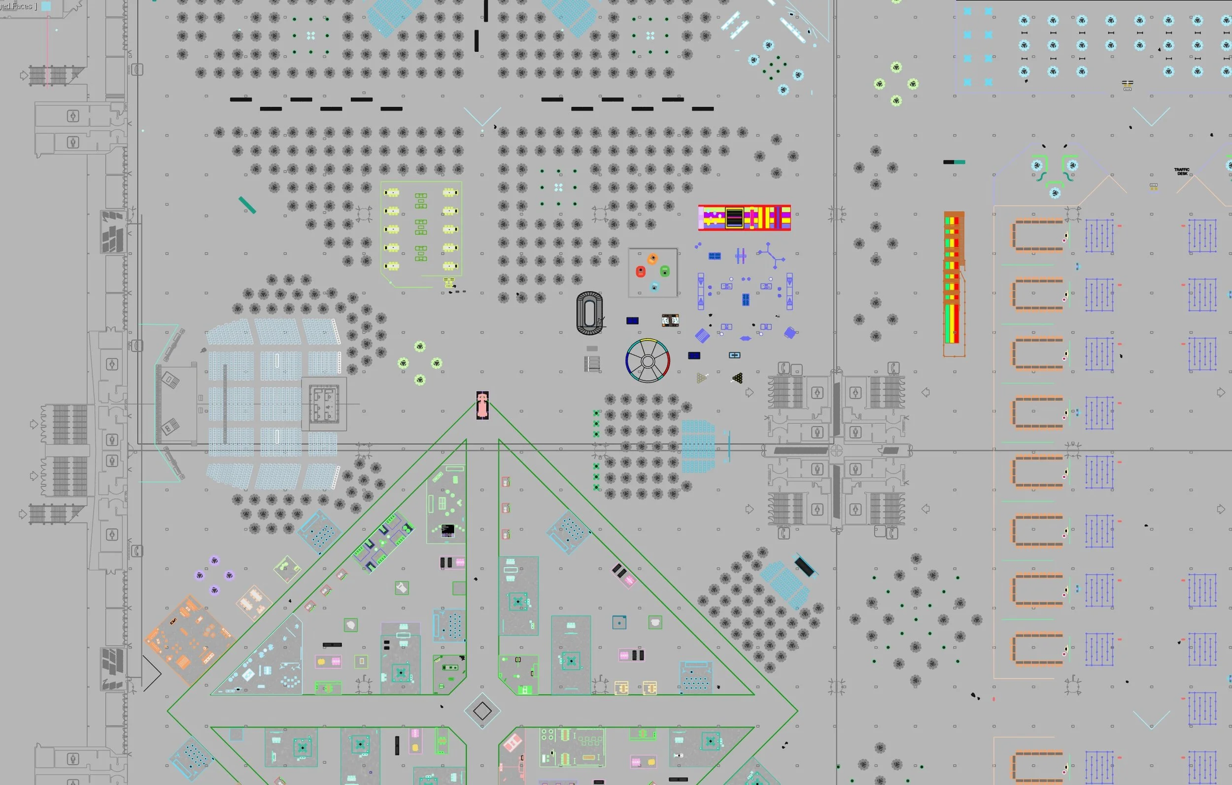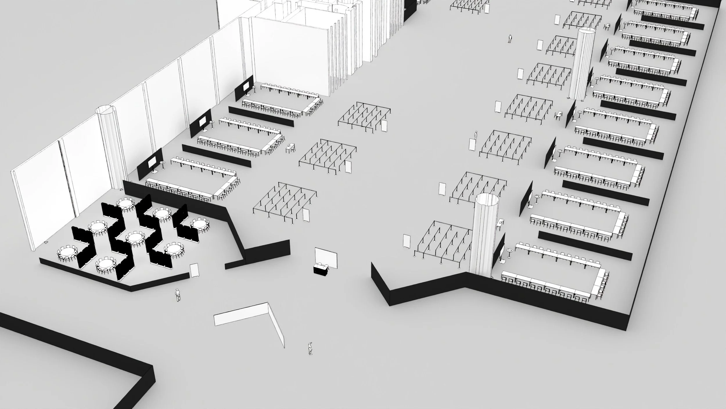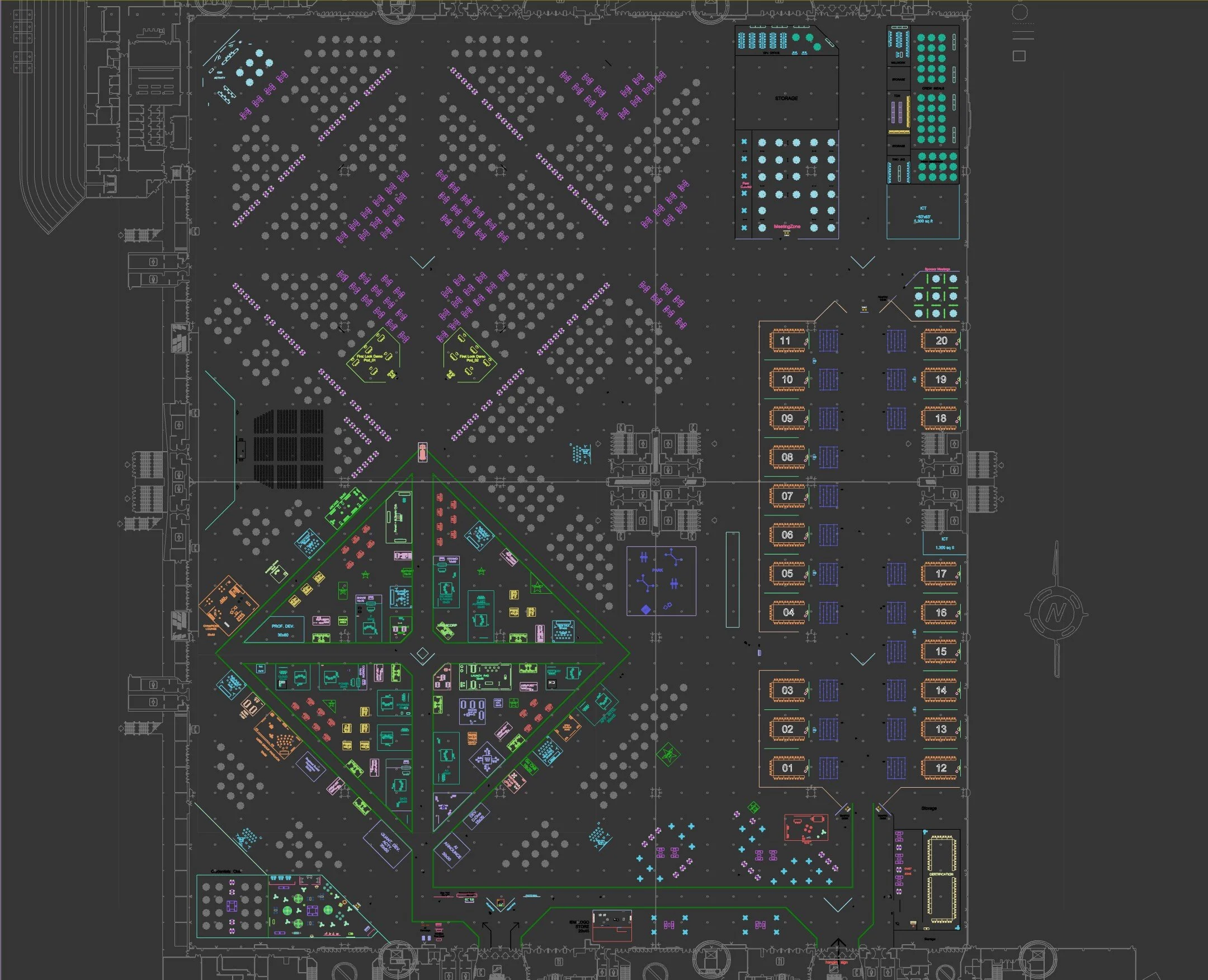 The floor plan went through multiple iterations to find the most intuitive circulation for a large-scale learning environment. Linear and grid layouts created visual barriers, so the design shifted toward a central diamond configuration that became the spatial anchor of the conference.